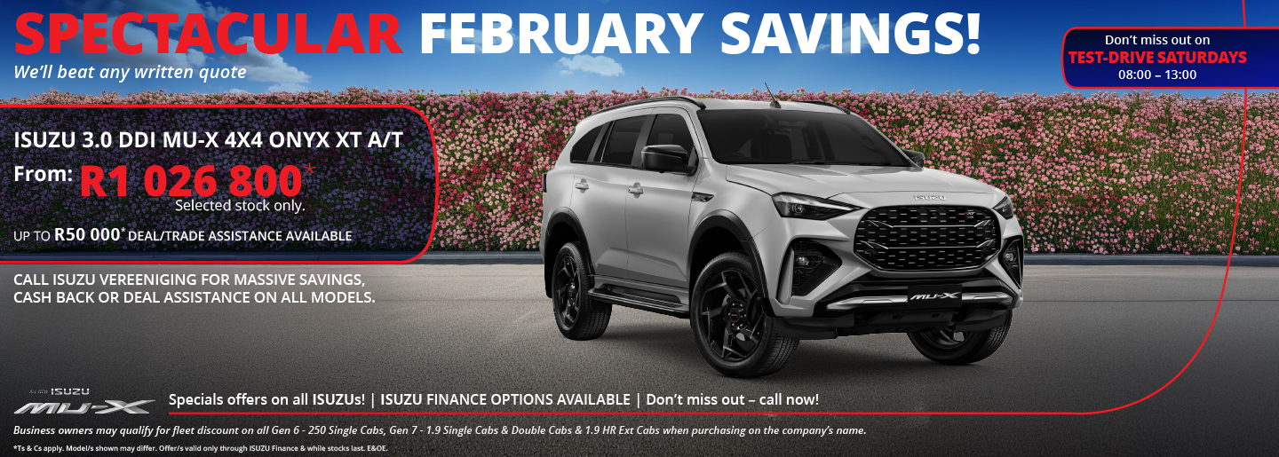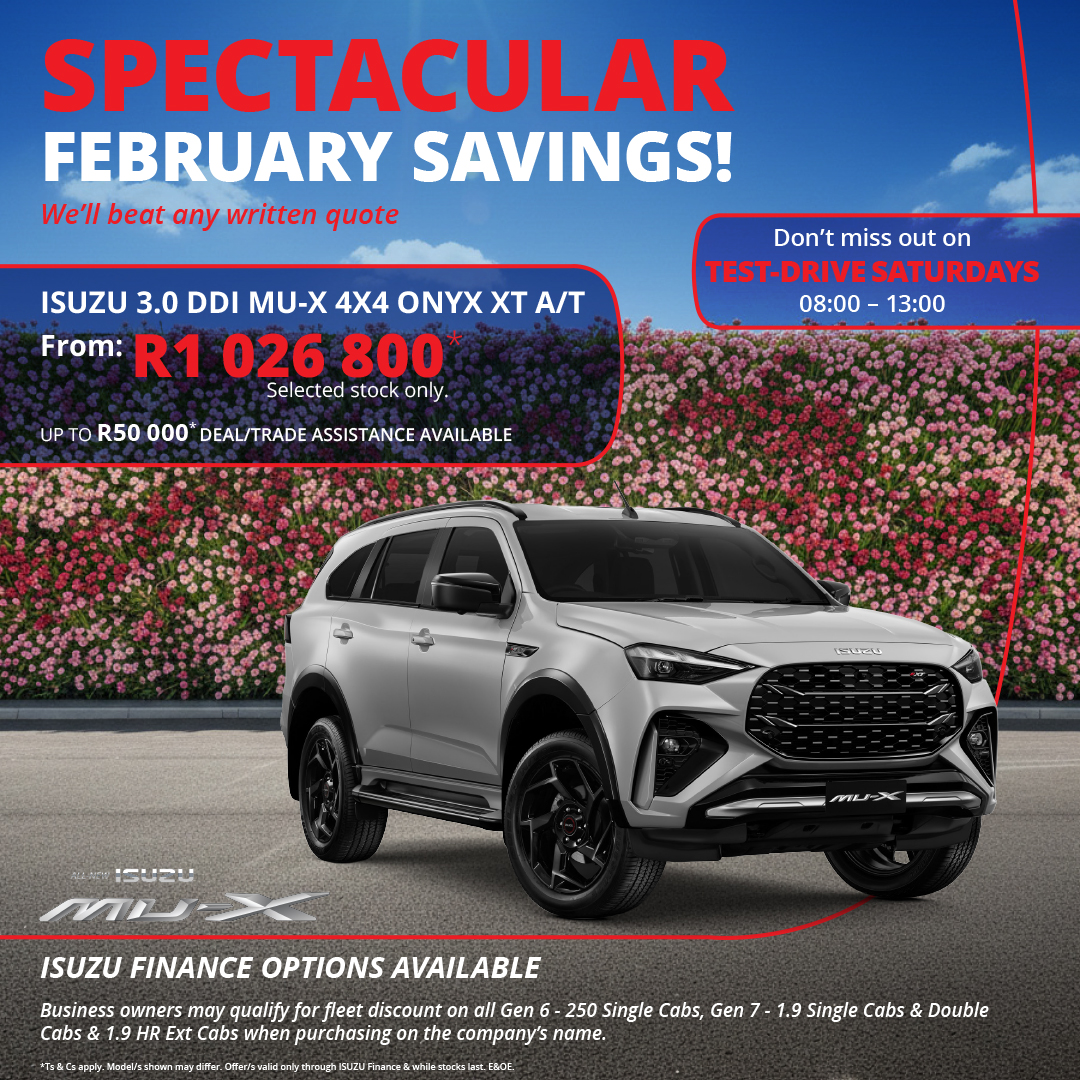 Spectacular February Savings on the Isuzu 3.0 DDi MU-X 4x4 Onyx XT A/T, now from R1 026 800 on selected stock. We’ll beat any written quote, with up to R50 000 deal/trade assistance available. Don’t miss Test-Drive Saturdays from 08:00 - 13:00. Isuzu finance options available.